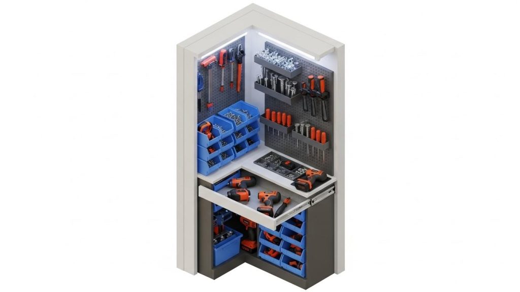 Шкафы для инструментов — одно из самых популярных решений. Они бывают металлические, деревянные, оснащённые ящиками, отсеками и полками различной конфигурации. В компактных вариантах можно использовать узкие высокие шкафы, что позволяет экономить полезную площадь пола и задействовать стены.