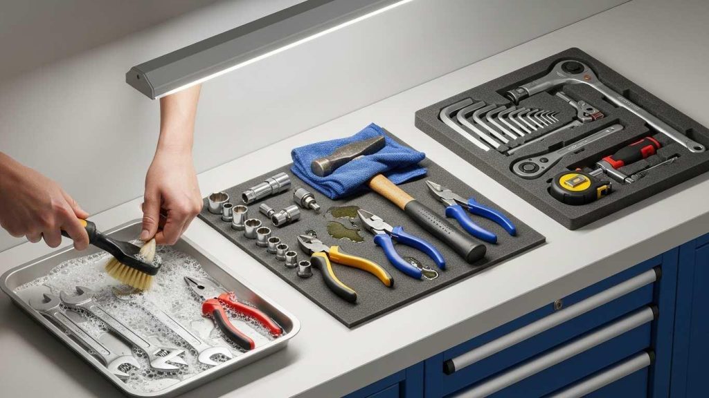 | Ручные инструменты (отвертки, плоскогубцы) | Мыльный раствор, спирт, мягкая щетка | Минеральное масло, вазелин | Удалять коррозию наждачной бумагой, хранить в сухом месте |
