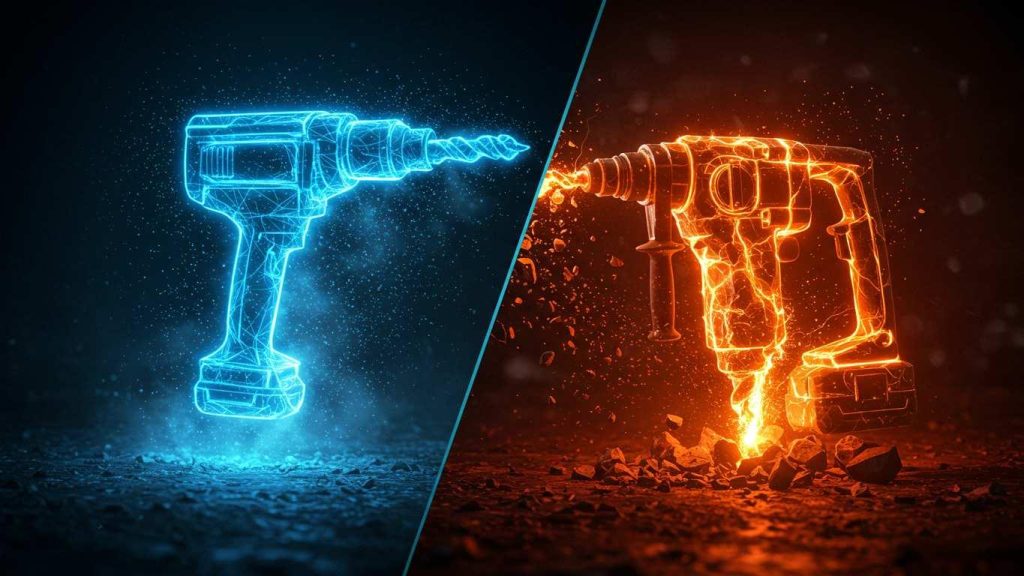 | Тип удара | Ударная дрель — механический или электронный толчок оси | Пневматический или электромеханический удар с высокой энергией |
